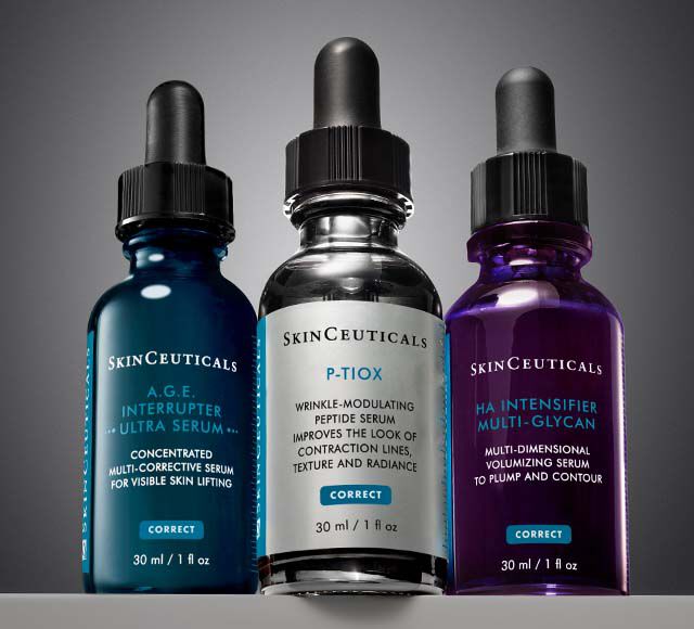 Topical antioxidants: Using topical antioxidant serums formulated with l-ascorbic acid at the proper concentration and pH has been shown to neutralize free radicals generated by environmental aggressors that can contribute to fine lines and wrinkles. The synergistic blend of vitamin C, vitamin E, and ferulic acid found in our C E Ferulic antioxidant serum has been proven to improve the look of existing fine lines as well. SkinCeuticals also offers AOX+ Eye Gel, a vitamin C-based serum that protects delicate, vulnerable skin around the eyes while improving the appearance of fine lines and dark circles.